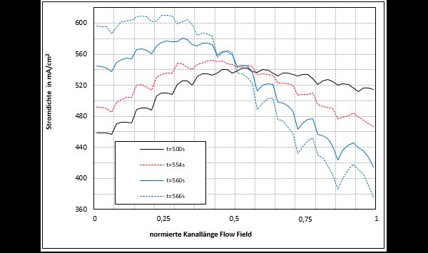 Die Stromdichte der Membranbereiche am Medieneingang steigen um den Wert, den die Stromdichte Richtung Medienausgang entlang des Strömungskanals während der Flutung absinkt. Die Membran im Eingangsbereich leistet nun bis zu 600 mA/cm² (vorher 470 mA/cm²) gegenüber zirka 380 mA/cm² am Ausgang (vorher 520 mA/cm²). Ein Zusammenhang zwischen der Drehzahl der Rezirkulationspumpe und den veränderten Feuchtigkeitsverhältnissen in den Ausgangsbereichen der Flow Fields konnte abgeleitet werden.